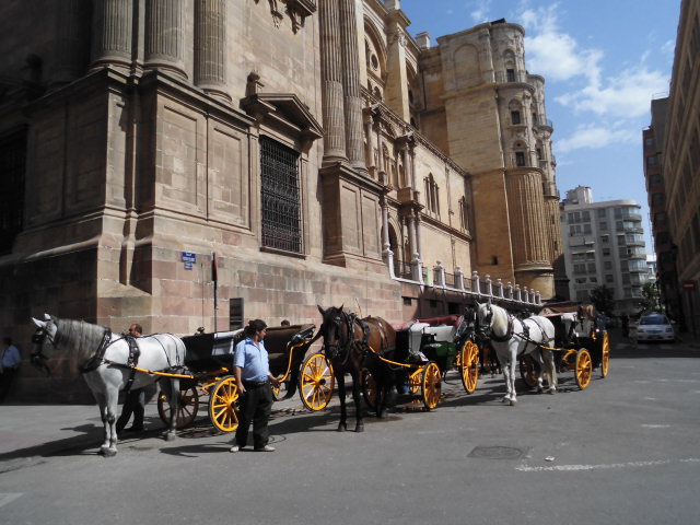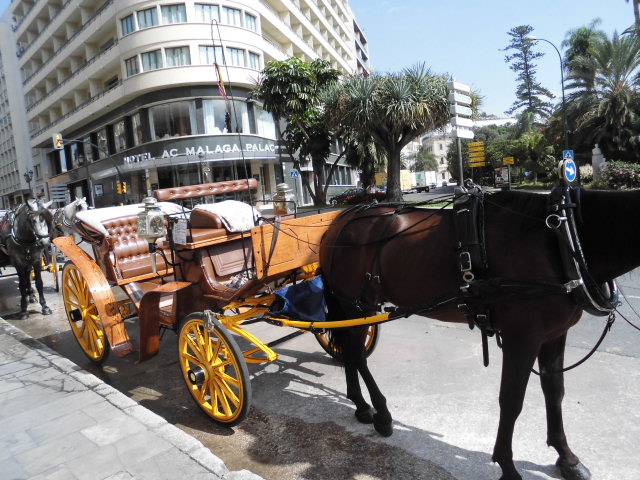 マラガ散歩道ガイド マラガ中心街を馬車で散歩 2014-10-11 momoquimidori コメントする 「マラガ散歩道ガイド」今日は「マラガ中心街を馬車で散歩」を紹介します。 このように、馬&セニョールが客待ちをしています。乗り場は二つ。まず、左の写真の「カテドラル(大聖堂)」の横。 もうひとつはこちらの写真。「マラガパラシオホテル」のまん前。ヤシ並木を抜け、マラゲータ地区、闘牛場などをぐるりと40分かけて回ってくれます。4人乗りで30ユーロ。マラガの乾いたそよ風に吹かれながら馬車で散歩!とてもおすすめです。ただし、帽子を忘れずに。 2014-10-11 momoquimidori コメントする