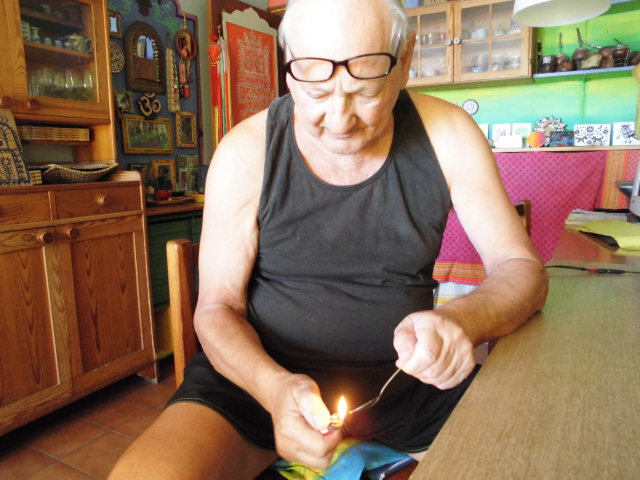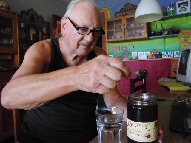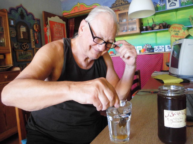 ぜいたく貧乏食堂 はちみつの実験 2014-11-21 momoquimidori コメントする 「ぜいたく貧乏食堂」今日は「はちみつの実験」を紹介します。 先日、ブログで修道士がすすめている「アロエはちみつ酒」を紹介しましたが今日は、そのための「はちみつ」が天然であるかどうかの実験をするらしい。べラ、うれしそう。 本物のはちみつは「水の中でもすぐには溶けない」らしい。スプーン一杯を水の中に入れてみる。ふーん、とりあえず底にたまってますね。 本物のはちみつは「火がつく」らしい。本当?誰から聞いたんだ?って、口をはさもうと思ったけどあんまり真剣なのでそっとしておこう。がんばってね。 2014-11-21 momoquimidori コメントする