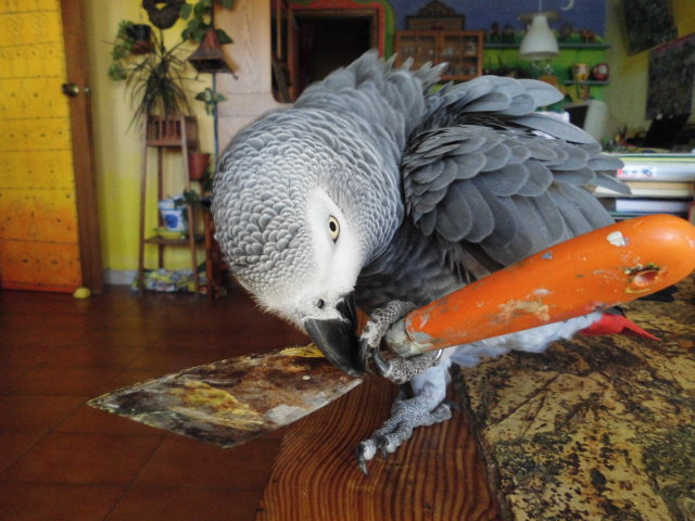 うれしいとき、怒っているとき、感情が「立ち毛」となって表れる(左の写真)。この立ち羽毛状態のときは、ほおっておきましょう。今日は、私のペイント用具を、おもちゃにしてますね。