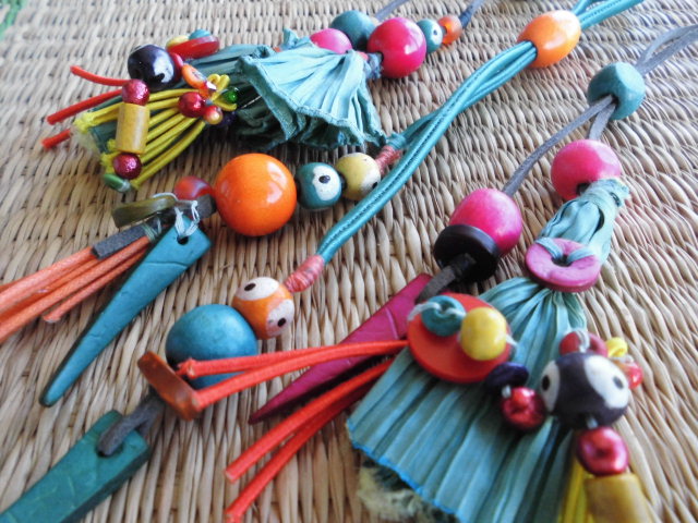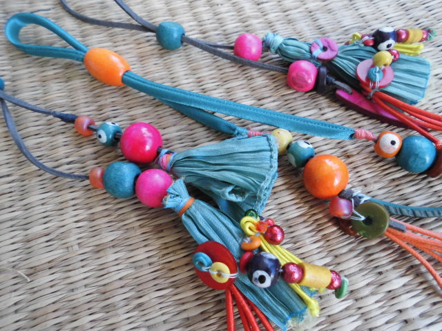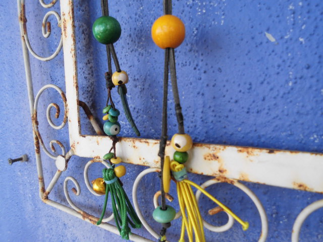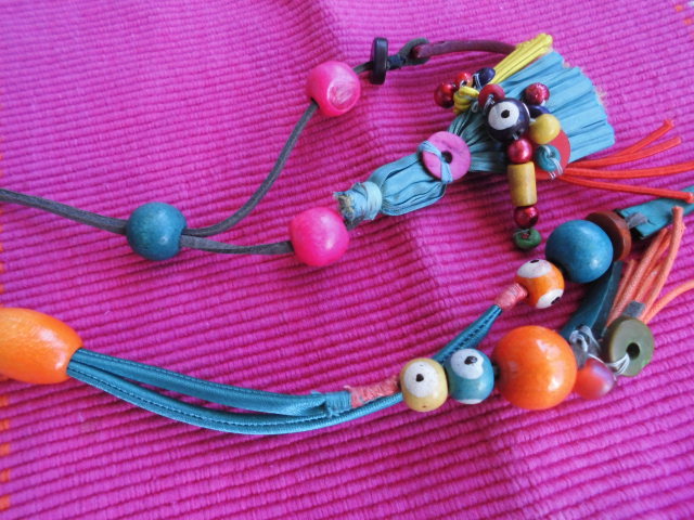 皮ひもに、玉やふさ、ボタンや木片をくっつけて、アクセサリーを作ってみました