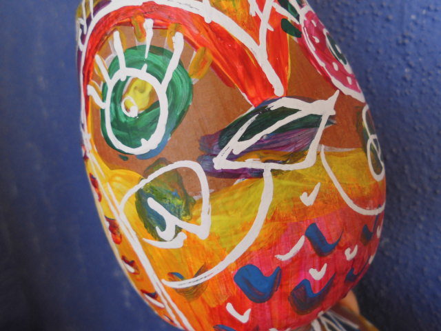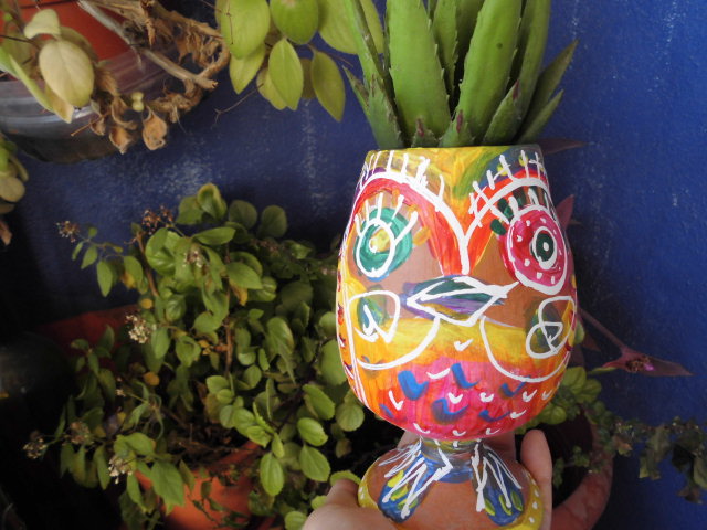 ももギャラリー2014 七色ふくろう 2014-12-17 momoquimidori コメントする 「ももギャラリー」今日は「七色ふくろう」を紹介します。 もとは素焼きの茶色い陶器。ペン立てだったのですが何気なく眺めていたら「ふくろうに見える・・・」 で、ペイントしちゃいました。足が描けるところがいいなぁ。 頭には植物をさして、パイナップル風のたてがみに。あれ、ふうろうにたてがみはなかったっけ?じゃ、とさか?ちがうな。ま、ヘアースタイルってことで、いいでしょう。 2014-12-17 momoquimidori コメントする