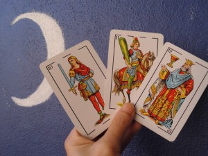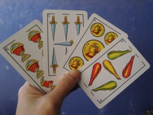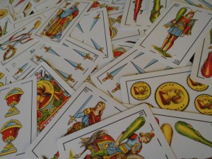 そうしたところ、トランプにもいろいろ種類があり、日本で使われているのは英米式と呼ばれるもののようです。そして、スペインで使われているのはラテン式と呼ばれるものらしく、イタリアやラテンアメリカでも同様のタイプのトランプが一般的のようです。ただし、ラテン式は本来8、9、10が無いらしい。