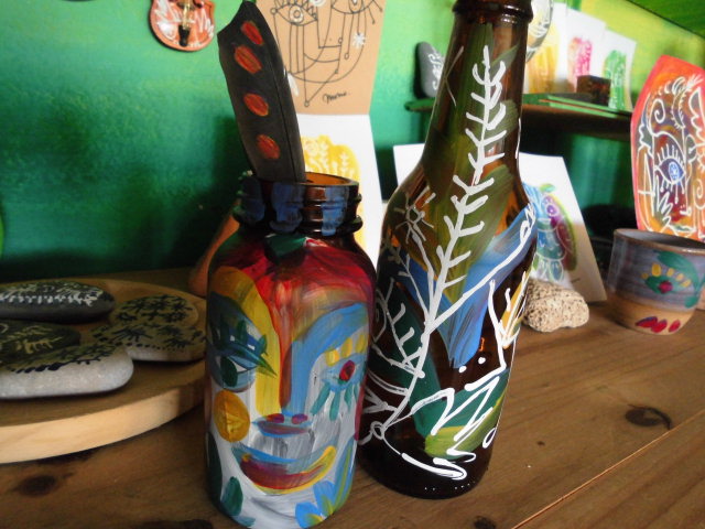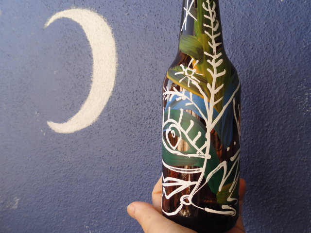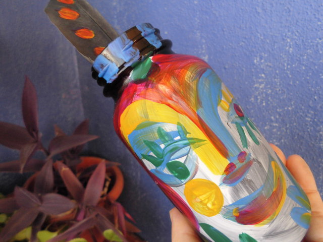 ももギャラリー「ボトルアート」 小瓶の精 2014-11-23 momoquimidori コメントする ももギャラリー「ボトルアート」今日は「小瓶の精」を紹介します。 今日のキャンバスは「小瓶」。もとは「薬」と「ビール(小)」のボトル。ワインボトルよりずっと小さい。 瓶から上に、にゅっと出てるのは鳥の羽根。うちのオウムに協力してもらいました。オレンジでペイントしてアート作品の一部に早変わり。ビール瓶も、あっというまにアートに早変わり。あ、だからってべラ、飲まなくていいからね。 2014-11-23 momoquimidori コメントする