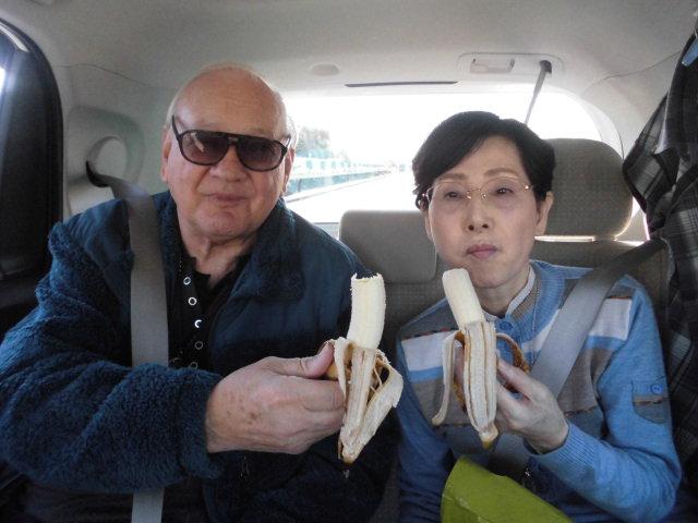 途中、恵那インターで早めの昼食。温かい緑茶がニッポンではいつも無料なのに、感動~のべラ。スペインは水だって有料だもんね。味噌カツ、カレーうどんでおなかいっぱい。そして食後のデザートは、車に戻ってバナナ。