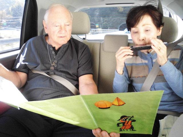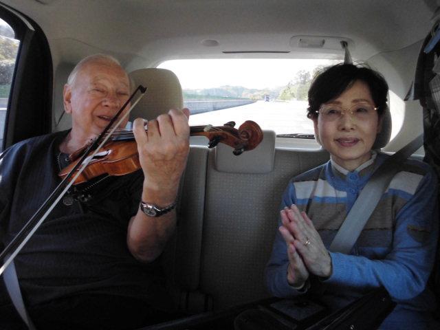 車の中でも練習に余念のない母。譜面台のべラ、目が真剣~。「とみ子さん、昨夜よりずっといいです」やっと安心し、自分もバイオリンを取り出す。