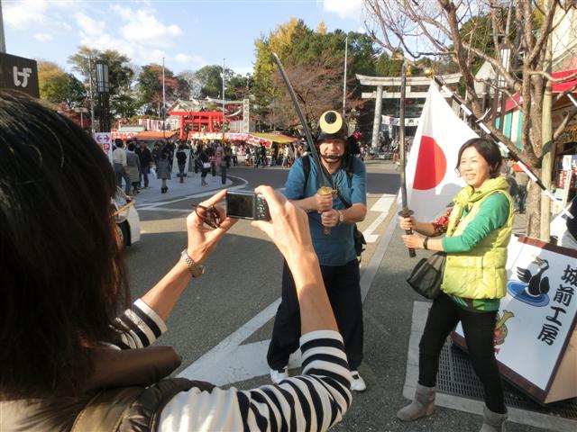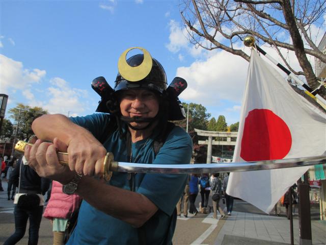 秋晴れの犬山で、ニッポンの国旗といっしょに、はい、ポーズ。