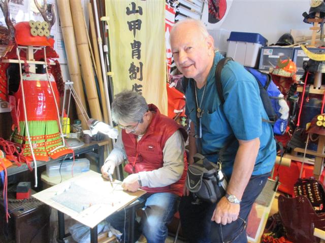 通りに「甲冑店」を見つけ、吸い込まれていくべラ。こういう時だけ、腰の痛みを忘れるらしい。