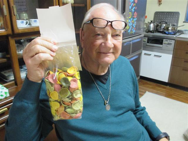 お昼に作るパスタを見せながら