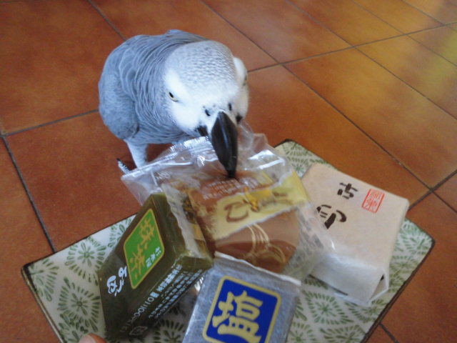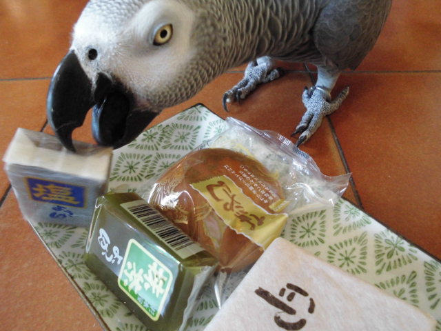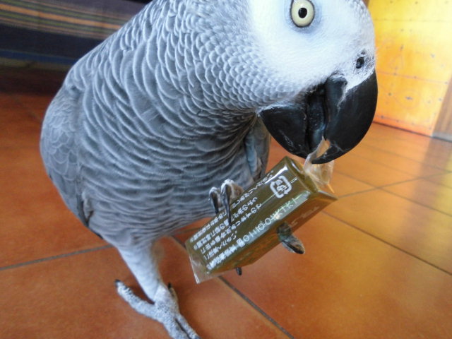 ニッポンのお菓子に食らいつくオウム。目が輝いてる~。