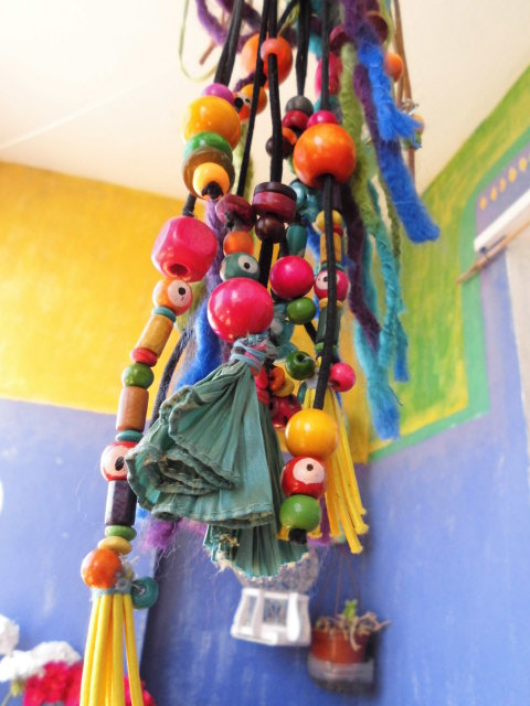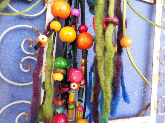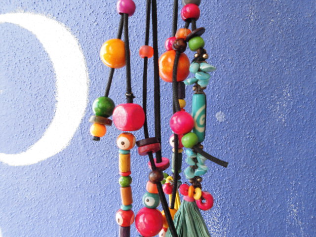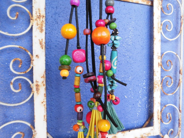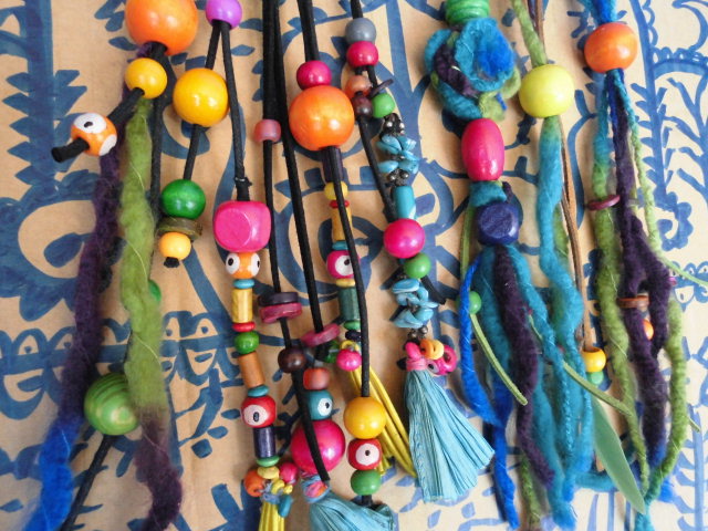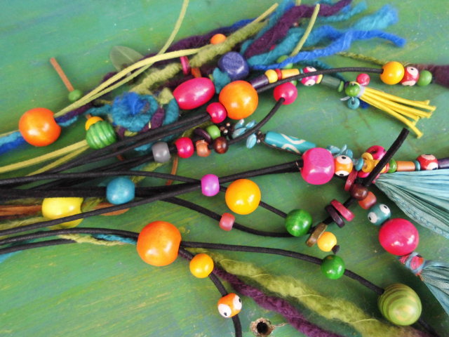皮ひもに、木の片や玉、ふさなどを縫いつけるだけ。