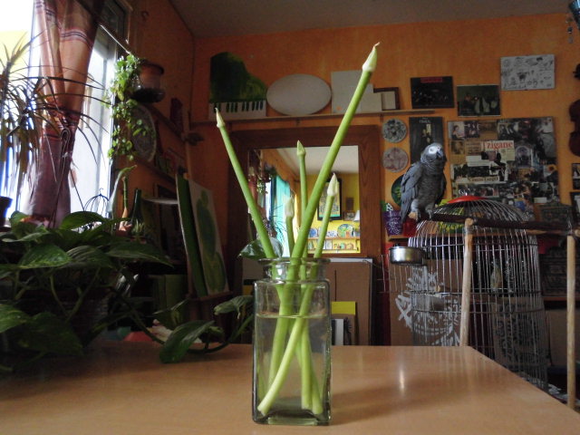 近況2015 ねぎ坊主を飾ってみた 2015-06-25 momoquimidori コメントする 気がついたら「ねぎ」から、にゅっと突き出てました。「ねぎ坊主」でよかったですか(疑)まったく自信なし。 捨てるのも何なのでガラスの器に飾ってみました。それが、いい感じ。 涼しげ~。すっきりとして生け花みたい。 あんまりうれしくて、テラス、作業机、リビングのテーブルと、置き場所を日替わりで変えて楽しんでます。 やややっ。オウムが見てますね。明朝、襲撃されてボロボロになっていないことを祈りましょう。 2015-06-25 momoquimidori コメントする