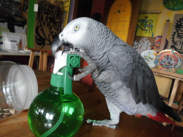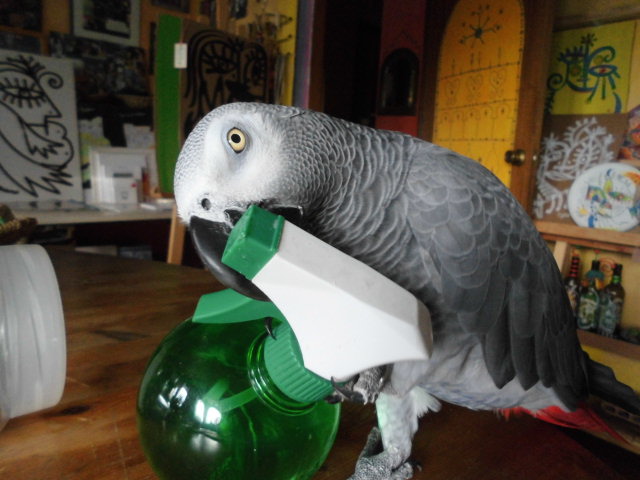 霧吹きを攻撃するオウム。結局、半日かかってこじ開けました。その集中力&継続力には脱帽。やってることの意味や目的はおいといて。