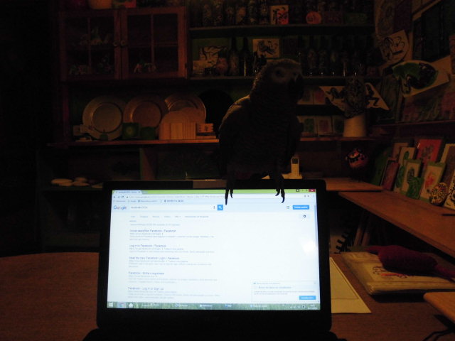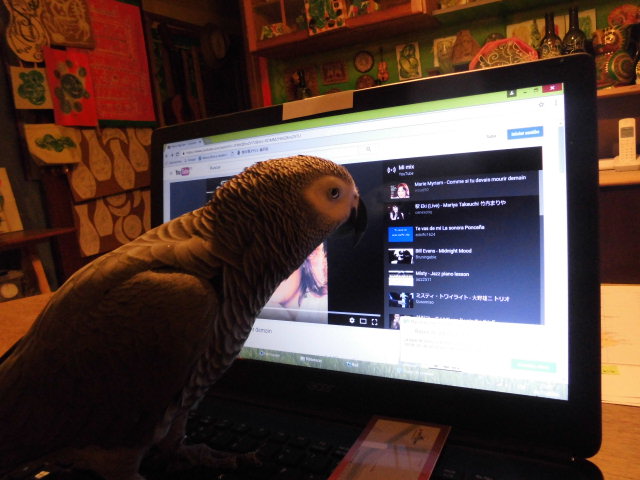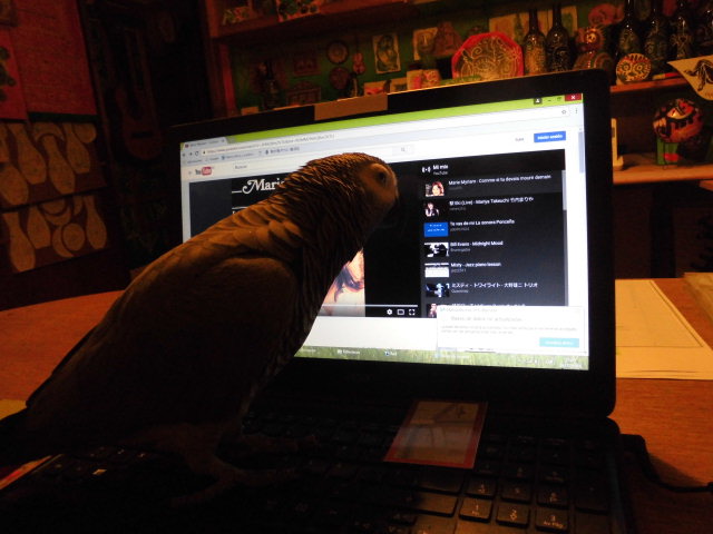 最近、うちのオウムはパソコンに興味しんしん。 何しろ「音が出て、画面が動く」ので、テレビのない我が家にとっては、唯一「家電」らしきもの。で、気がつくと、オウムがパソコンを見つめている。