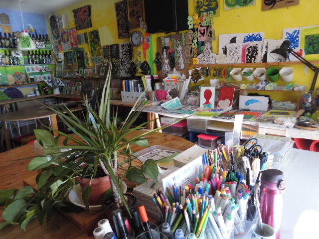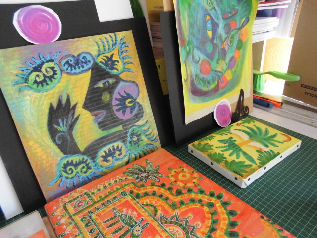段ボール箱の横縞が見えますね。オレンジの入ってた箱とかが気に入ってます。なにしろ丈夫!オレンジ数十キロに耐えるんだから、絵の具やマーカーなんて、赤子のひねるようなもの(ちがうか、使い方が)。