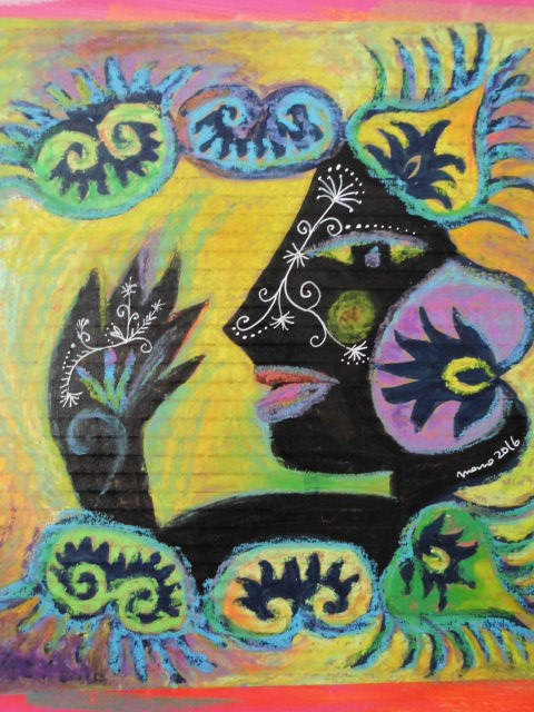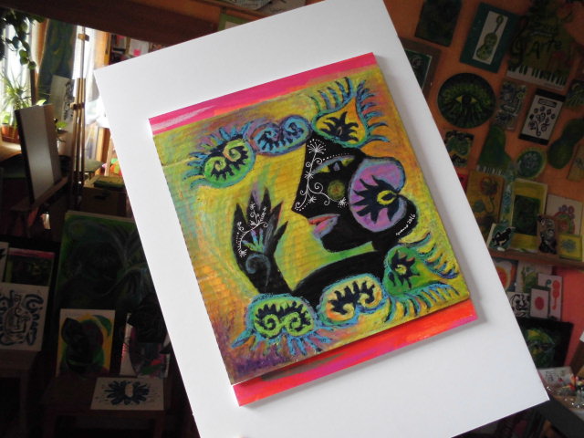 これが前段階。色を数回に渡って重ねていく。最後に顔に「白い模様」を入れる。イメージは「へンナ」。あのインドからモロッコにかけて女性が額や手の甲に描くお守りのシンボル。だから吉祥画。