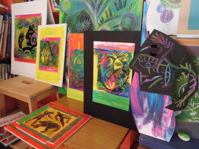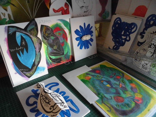 作業中のパネルアート。複数の作品を同時に進めていく。何回も段階を踏まえて作業を重ねていくので、絵の具や接着剤が乾くのを待つ。