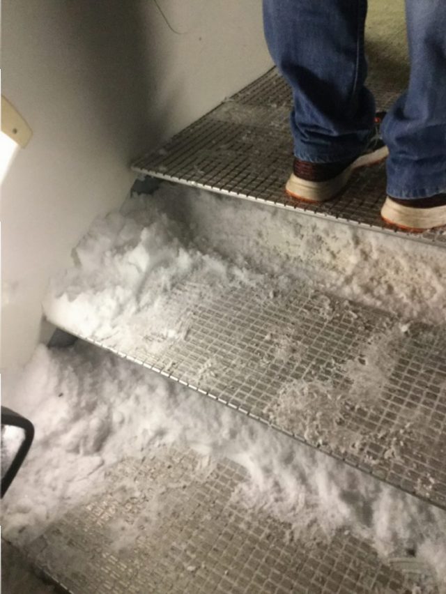 これはもう「乗客」でなく、「強制労働者」の列であろう。やっと飛行機が近づいてきた。鼻水が凍りそう。タラップへ足をかける。と、なんと!そこにまで雪が。こんな搭乗あり?