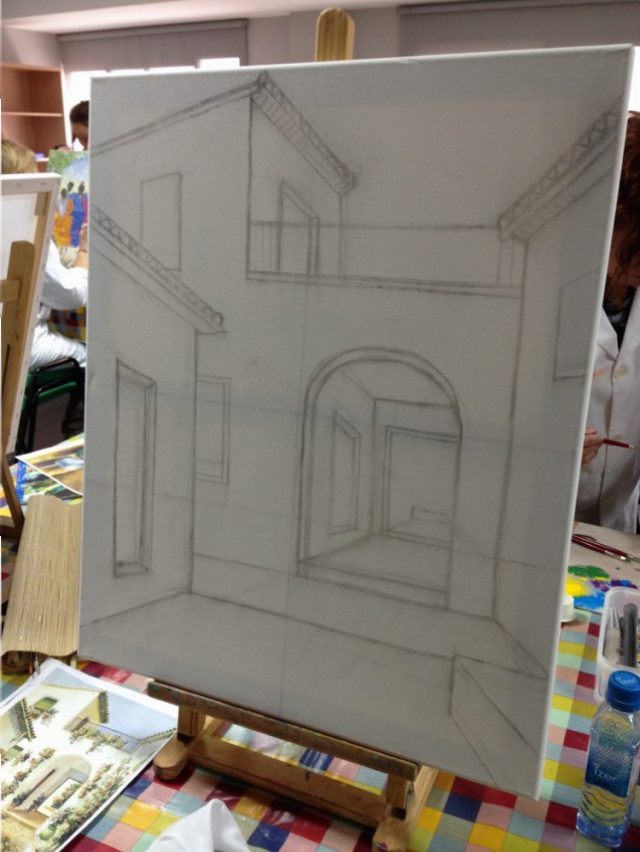 下の写真が、カーボンで下描きをしているところ。これ以上複雑なのは許可してもらえなかった。私としては白い村の「家々の白い壁が並ぶ立体感」や「奥行き」を、どうしてもやってみたい。この絵ではせいぜい三段階くらいの奥行なので・・・。六月まであるので、いくつかの白い村シリーズの習作に取り組みたい。