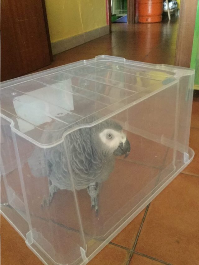 足取りも軽く、鼻歌まじりで家に戻ると、リビングではオウムが「食物倉庫を襲い、盗み食い」をはたらいていた。おしおきに、プラスチック容器の中に閉じ込める。というか、掃除する間、どこかに入れておかないと。わずか二、三分のことだったが、初めて見る不思議な世界に、キョトンとした表情。怖くはないらしい。