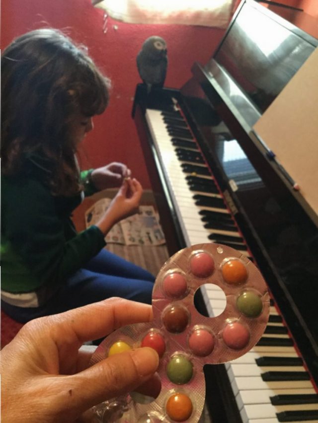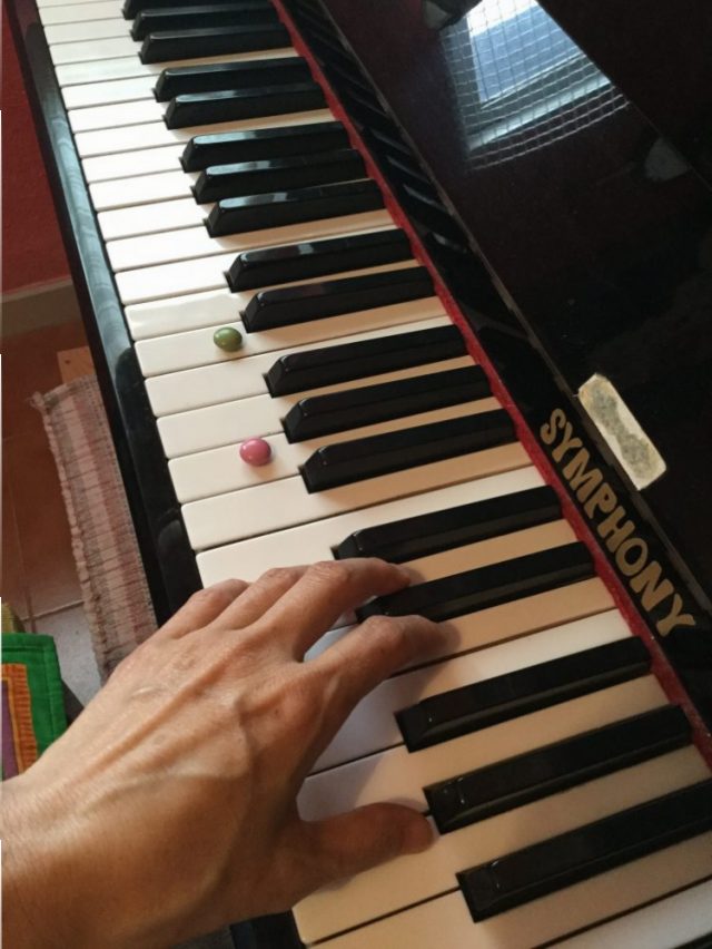 どう使うのかと言うと、「押さえる鍵盤の位置(たとえば、ド、ミ、ソ)」に、色の異なるマーブルチョコを一つずつ置き、