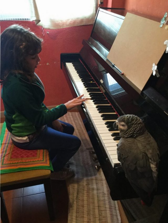 チョコレートとオウムの間で、ピアノレッスン。の図(写真一枚目)。今、グロリアちゃんは「ヘイ・ジュード」を練習中。あのビートルズの。ついつい一緒に歌っちゃう。もちろん、私は出だしだけ英語で、後はハミング。グロリアちゃんは最後まで英語(笑)。