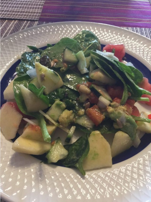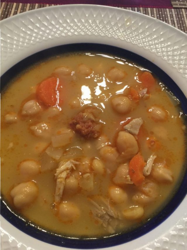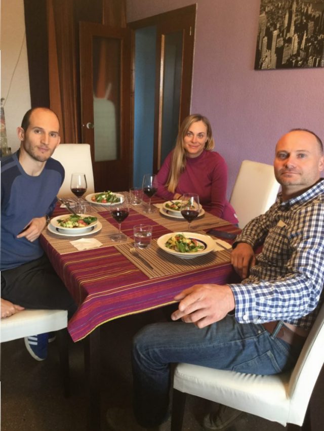 この日は、友人のインマ&ホセ夫妻の手料理をいただきに伺いました。スペインランチの王道。三つの皿を紹介しましょう。まず第一の皿はサラダ。具だくさん。そして第二の皿は、チキン&ひよこ豆と野菜の煮込み。最後がケーキ。これはハビ吉の差し入れ。