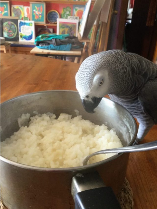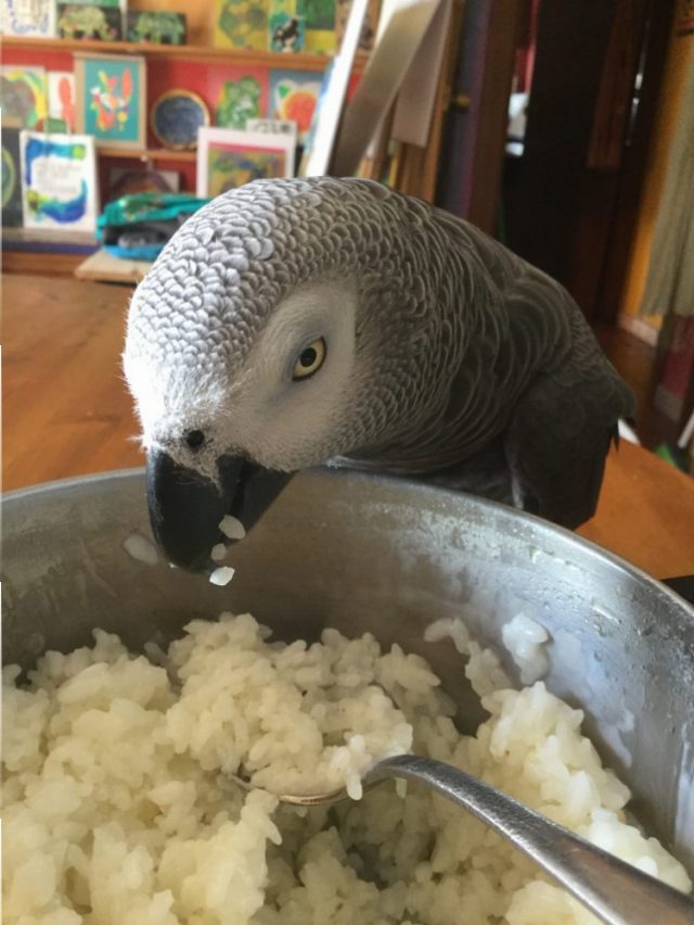ちゃんと「オウム用の食器」があるにもかかわらず、待てずにもう、くちばしを突っ込む。でも、ちょっと笑えるのはご飯が熱すぎて