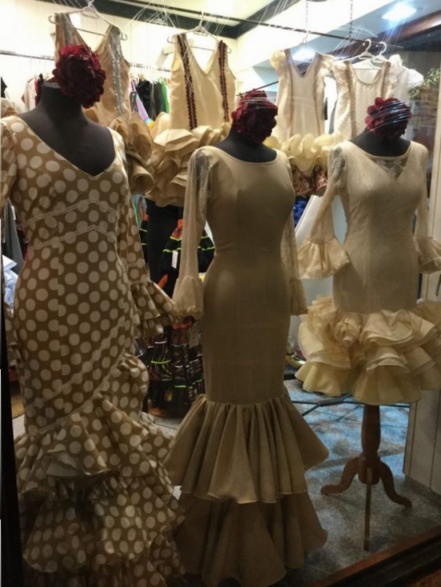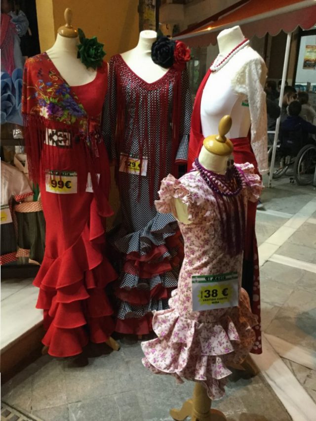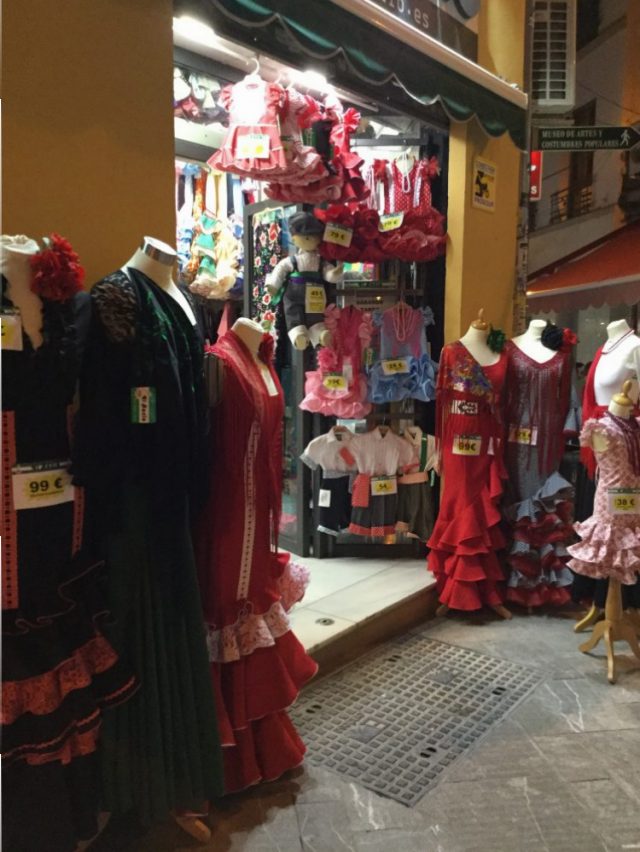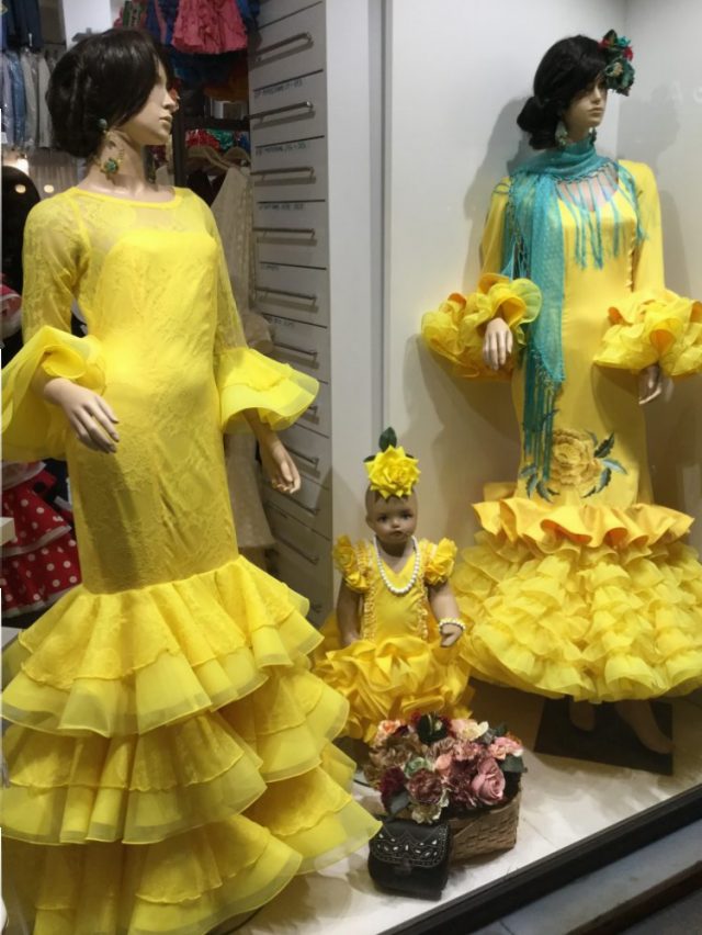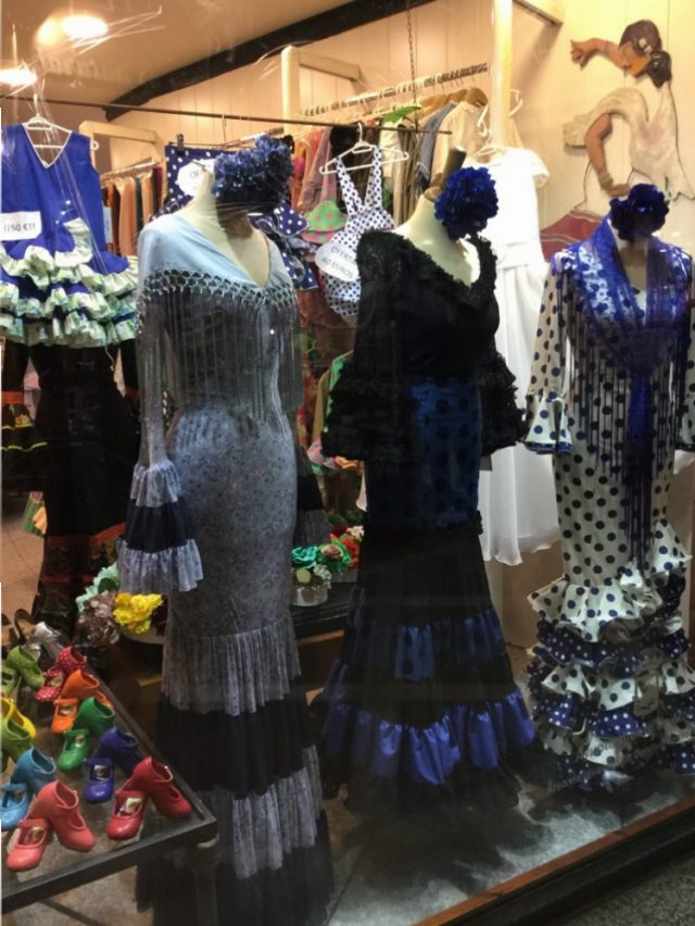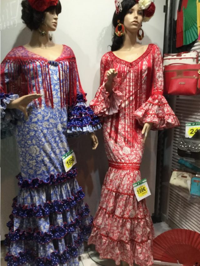 今日、紹介する写真は、マラガのセントロにある「衣装店」のディスプレイ。もちろん値段はユーロ!そう、マラガっ子には「セビジャーナス」に衣装はとっても高価なのだ。先生いわく