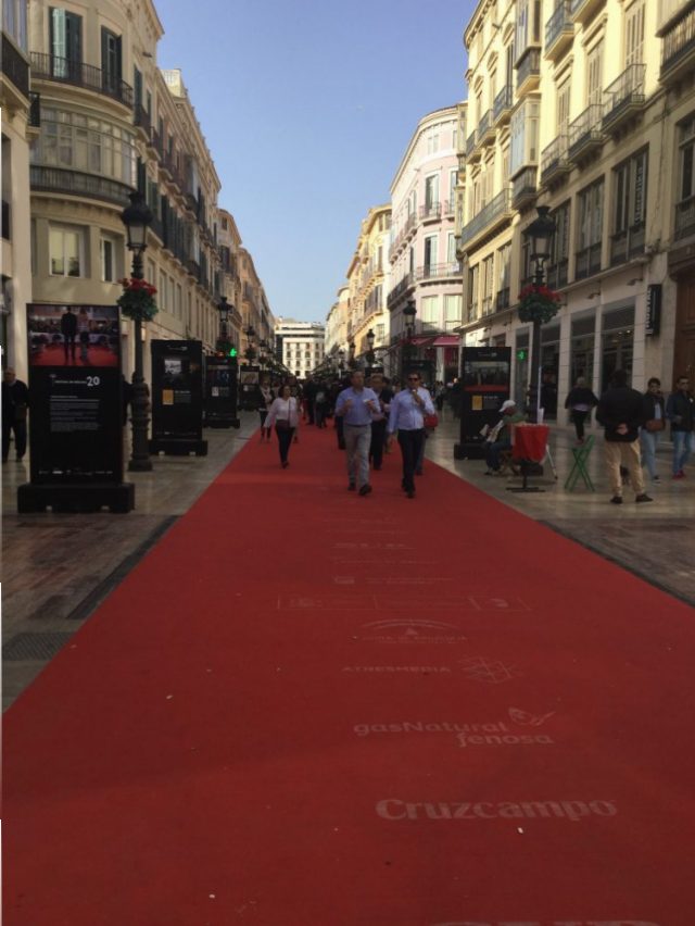 この3月17日から23日まで、マラガは「映画祭」で大賑わい。メインストリートのラリオス通りには、ほらこのとおり!赤じゅうたんまで敷かれて(一枚目)。ハリウッドの雰囲気。気持ちだけ。