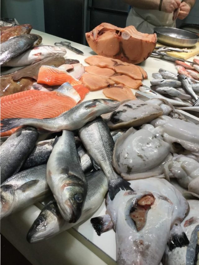 魚も肉も、かなり大胆なディスプレイ。おおざっぱな置き方なので、最初はびっくりするかと思います。日本はパック入りが中心なので、量が一目で見てわかりますが、スペインでは