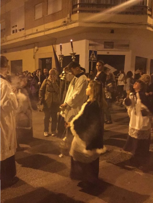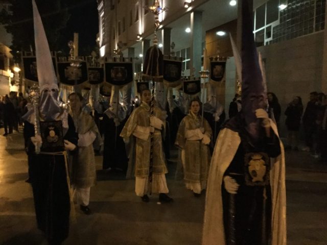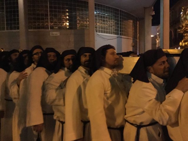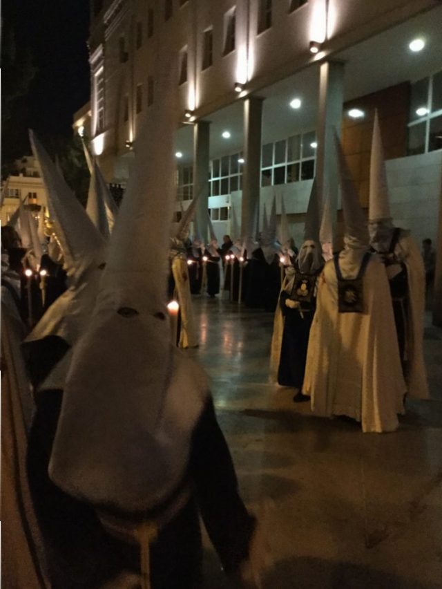 マラガのセマナサンタ(聖週間)は続く。「キリスト像」と「マリア像」を守るように、それぞれの教会の会員たちが、長い行列を形成します。