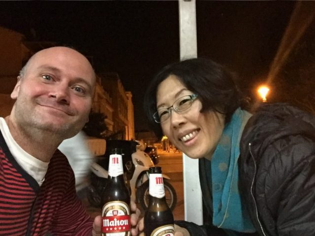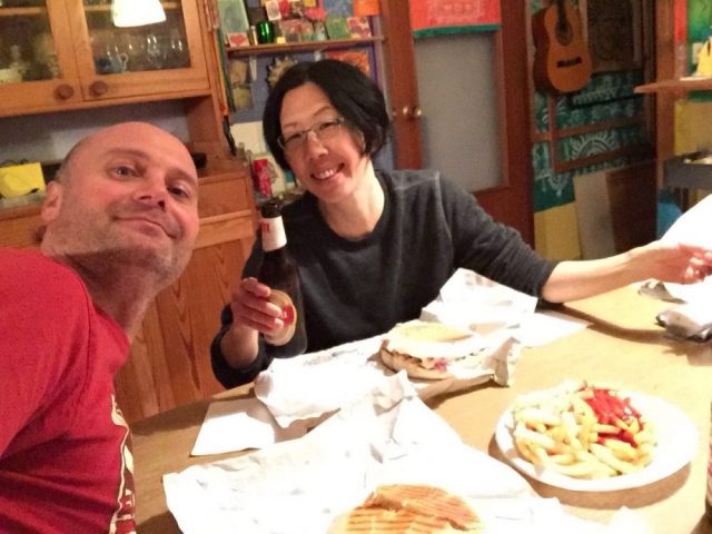「はい、マルーチのカンペーロと、ビール!温かいうちに食べよ」