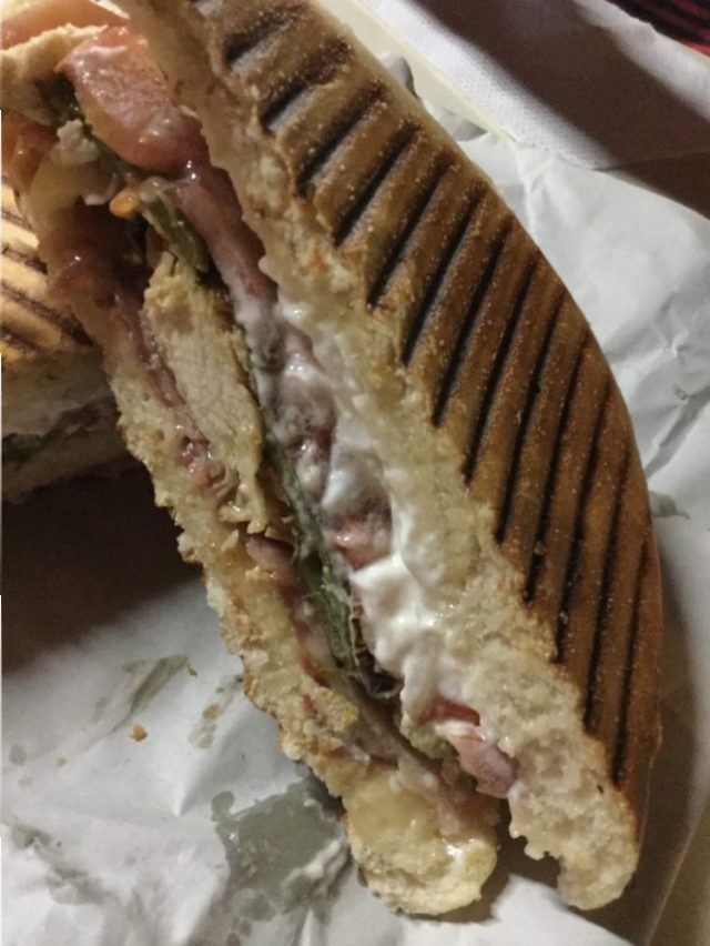 トーストしたパンに、チキン、ベーコン、チーズ、目玉焼き、ピーマン、玉ねぎ、トマト・・・などを、好みで注文。はさんでもらうシステム。パンは丸型で、これを半分に切って出される。