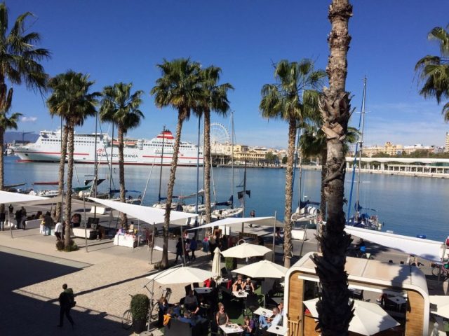 地中海クルーズの乗客を、一年中出迎え、見送るマラガ港。おしゃれなレストランやカフェテリア、お店が軒を連ねています。が、お値段はやや高め。