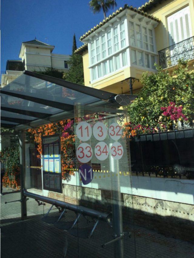 バスの路線番号が、しっかり明記されてます!さらに、すべての停留場には「番号」がつけられていて、その番号を市バスのアプリに入力すると「あと、何分で次のバスが来るか」教えてくれる!すごい~。このマラガで。