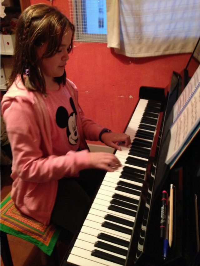 六年間という月日を一緒に過ごして、今や12歳。難しいコンセルバトリオの曲も、すらすらと弾けるようになった。でも、楽譜を読むのは超苦手。で、新しい課題曲が与えられるたび、音符とシャープ&フラットの確認に飛んでくる。