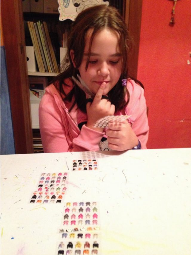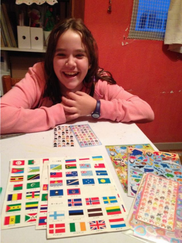 写真は、日本からのお土産シールを前に、大喜びするカーラちゃん。手前の国旗は、毎週レッスンの休憩時間に、国旗をおぼえる遊びをしているから。おかげで私まで、国旗に強くなりました。