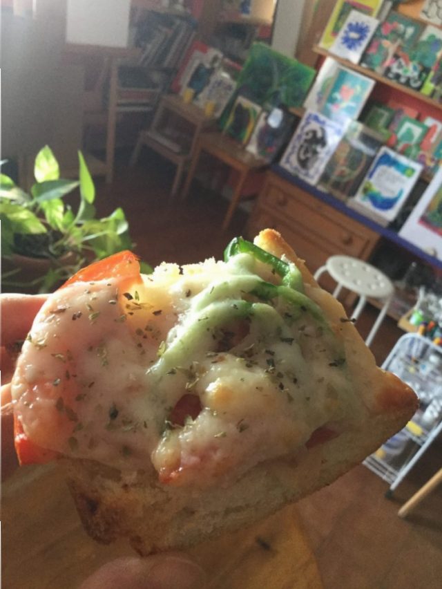 これを、だらっとパンの上にかけて、チーズ、ピーマンを乗せ、オレガノを振って、オーブンで二分。なんておいしい~ピザ的朝食パンのできあがり!