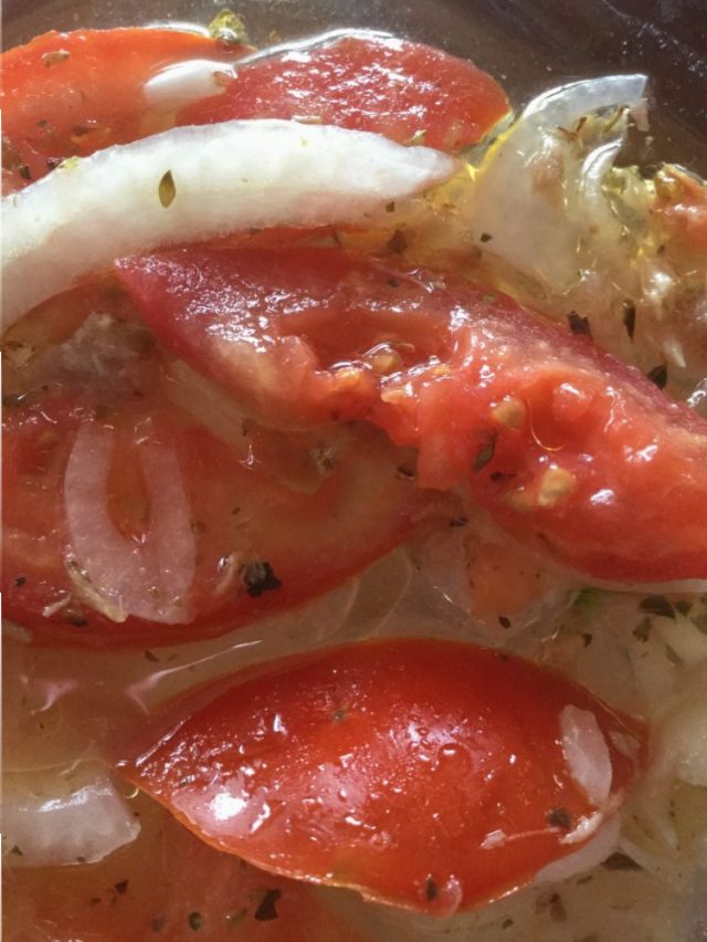 ポイントは、前日からトマトが「玉ねぎ、にんにく、塩、ビネガー」につけられ(っていうか、余ってほかってあっただけなんだけども)、味が染み込み、くたっとなって一体化しているところ。