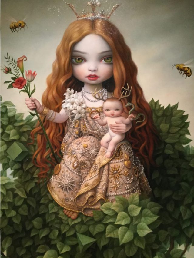 さて、作品はどれも不思議な、独特の世界観に包まれています。アーティストの愛情を、どの作品からも強く感じました。色の重ね方など、思わず見入ってしまって、「目」だけ見る、とか「バックの一部」だけ見る、とか部分的にやりだしたら、あっというまに一時間。