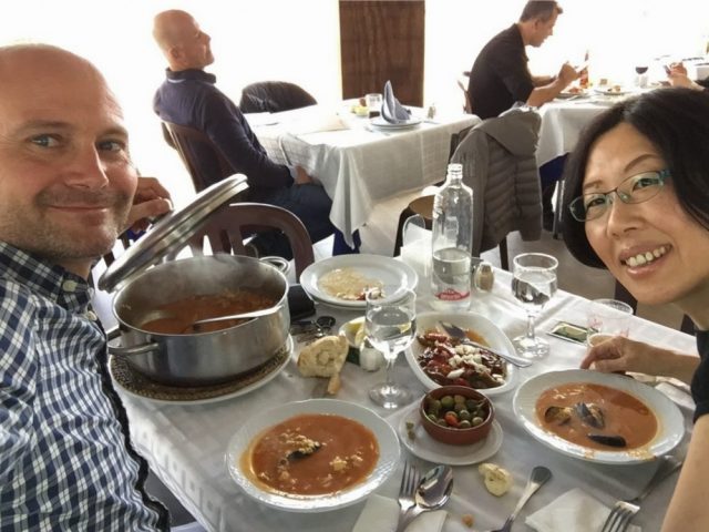 さて、今日の写真は「魚介類レストランランチ」の様子。三枚目の鍋のようなものは「アロス・カルドソ」といい、汁の多いパエジャのようなもの。これが日本のおじや、もしくは鍋料理に似ていておいしい!