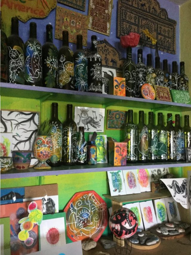 うちのリビングにある作品は、基本的に「商品価値がない」と思われたので、昨年の日本の「展示会」には持って行かなかった。例えば、ペイントされているのが、八百屋のダンボールや、ショッピングバッグ、紙袋、木片、ボトル、れんが・・・などの廃材。で、さらに耐久性のある処理も施されていないし、端っこは欠けたり曲がったり。