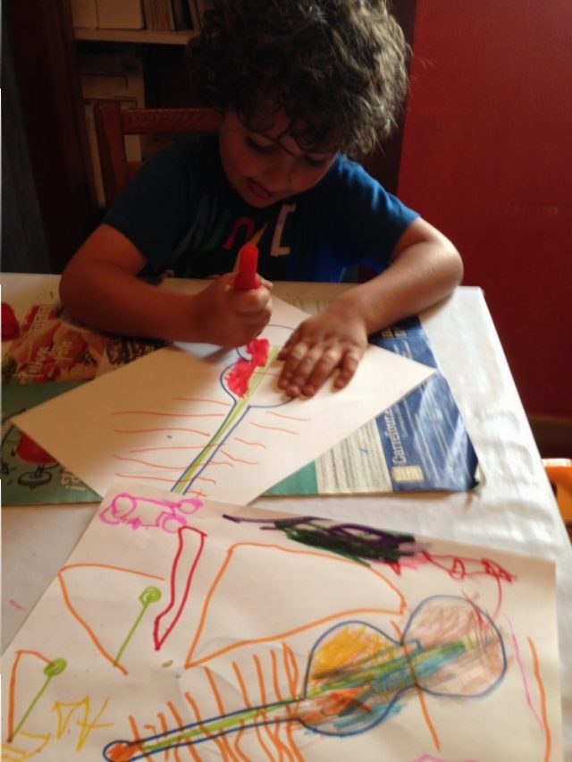 お絵かき中のカルロス君。大好きなバイオリンを描いてます。目の前のことによく集中できるようになったね。最初、始めた時は十分もイスにじっとしていられなくて、教室に残るのがいやで半泣きだったね。きっと