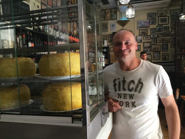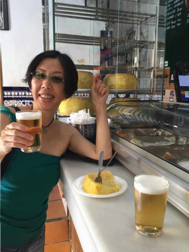 さすがに疲れて、バルで休憩。冷たいビールで乾杯。さて、写真のこの巨大な黄色い円型のものは、いったい何でしょう?(十、十一枚目)チーズ?いえいえ。似てますが、実はこれトルティージャ。そう、スペインオムレツ。