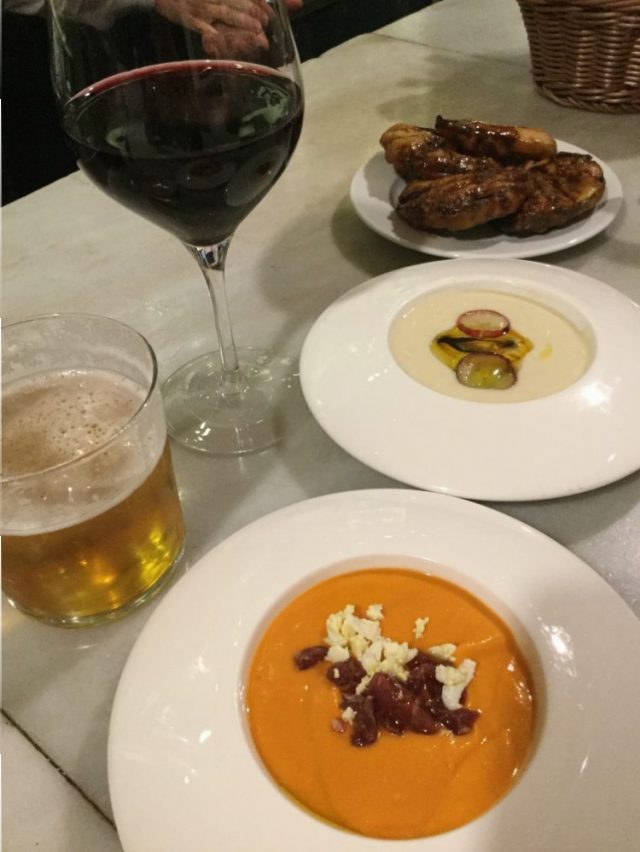 私たちが選んだのは「サルモレホ」「アホ・ブランコ」「なすのフライ」。これがもう、至福の味!(写真十一枚目)。中央の白いスープが「アホ・ブランコ」。アーモンド、にんにく、オリーブオイルで作る、シンプルかつおいしく作るのが難しい一品。