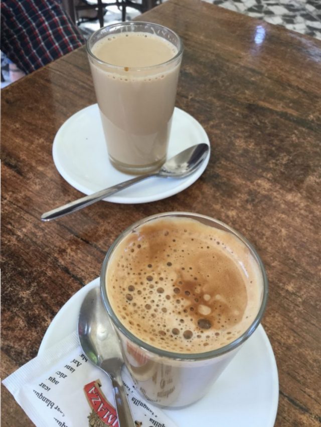 さて、メスキータを堪能した後は、カフェテリアへ。やっと待ちに待った朝食。写真手前が私の頼んだ「カフェ・ミタ(コーヒーとミルクが半々)」。後ろのがハビ吉の頼んだ「ミルクの分量が多いコーヒー」(五枚目)。