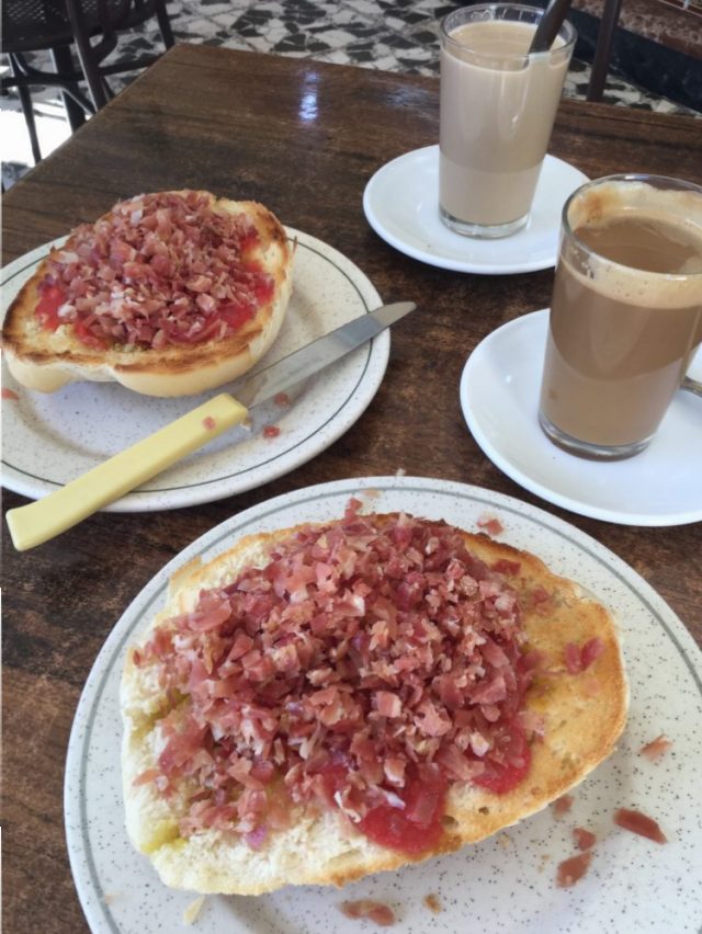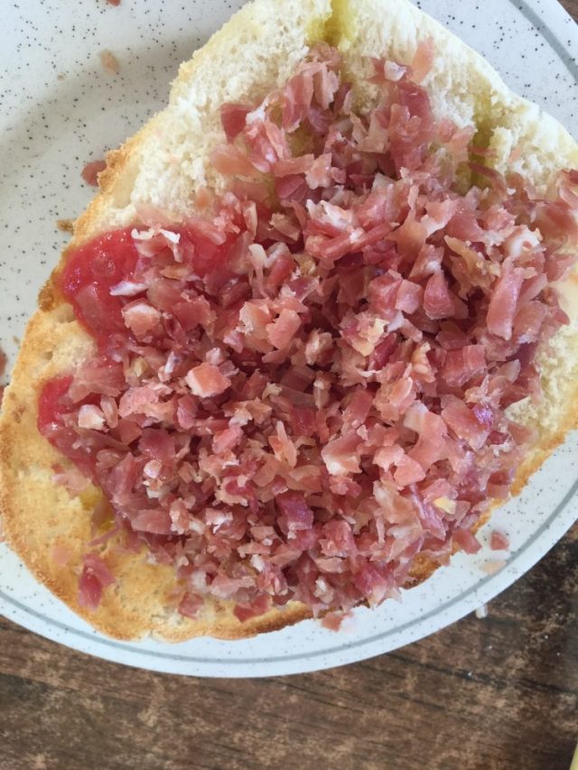 そして、頼んだ「生ハムパン」も、まったく見たことのないスタイル(六枚目)。マラガでは生ハムのスライスしたものが数枚、どん!と乗っているのだが、ここコルドバではなんと!生ハムが小刻みに。おぉお。