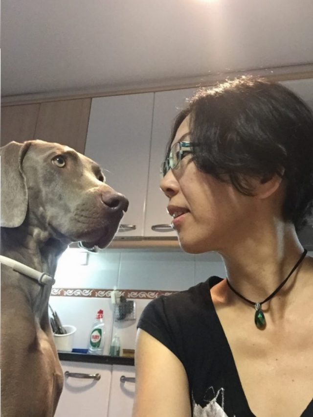 犬ちゃんのムーサは人なつこく、食事中も一緒。二歳のメス犬。光の具合によって、灰色にもベージュにも、銀色にも薄いピンク色にも見える不思議な犬(七、十枚目)。