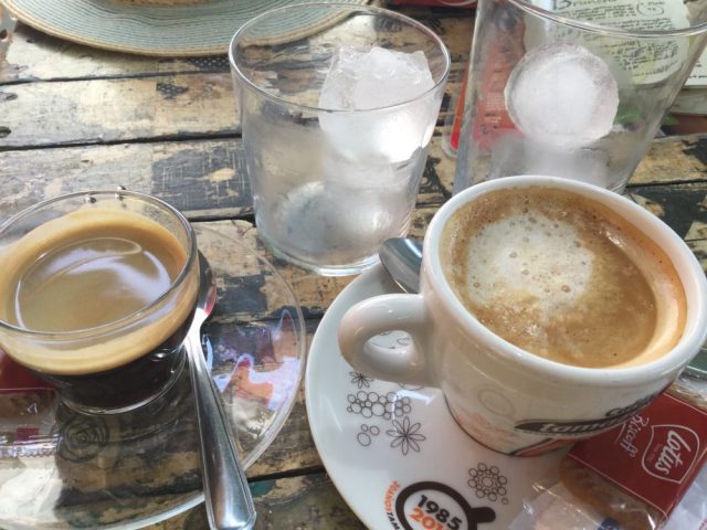 三枚目の写真をご覧ください。これぞマラガ式アイスコーヒー。「アイス」を頼んでも、ホットと同じ状態で出てくる。これを「氷入りグラス」に注いで、自分でアイスにする!オーレ!すばらしい。