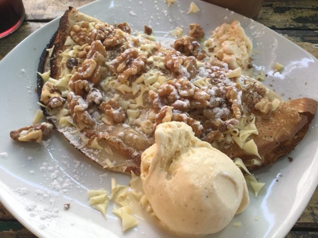 のつもりが「クレープ」も、頼んじゃいました。お隣のテーブルがおいしそうに食べてたので(笑)つい。これが大きい(写真一枚目)。私たちが選んだのは「ホワイトチョコ&クルミ&アイス」。